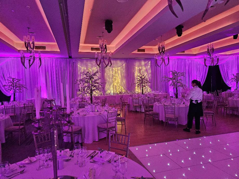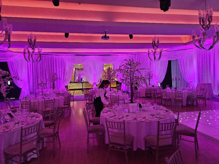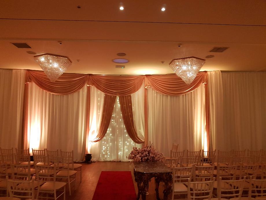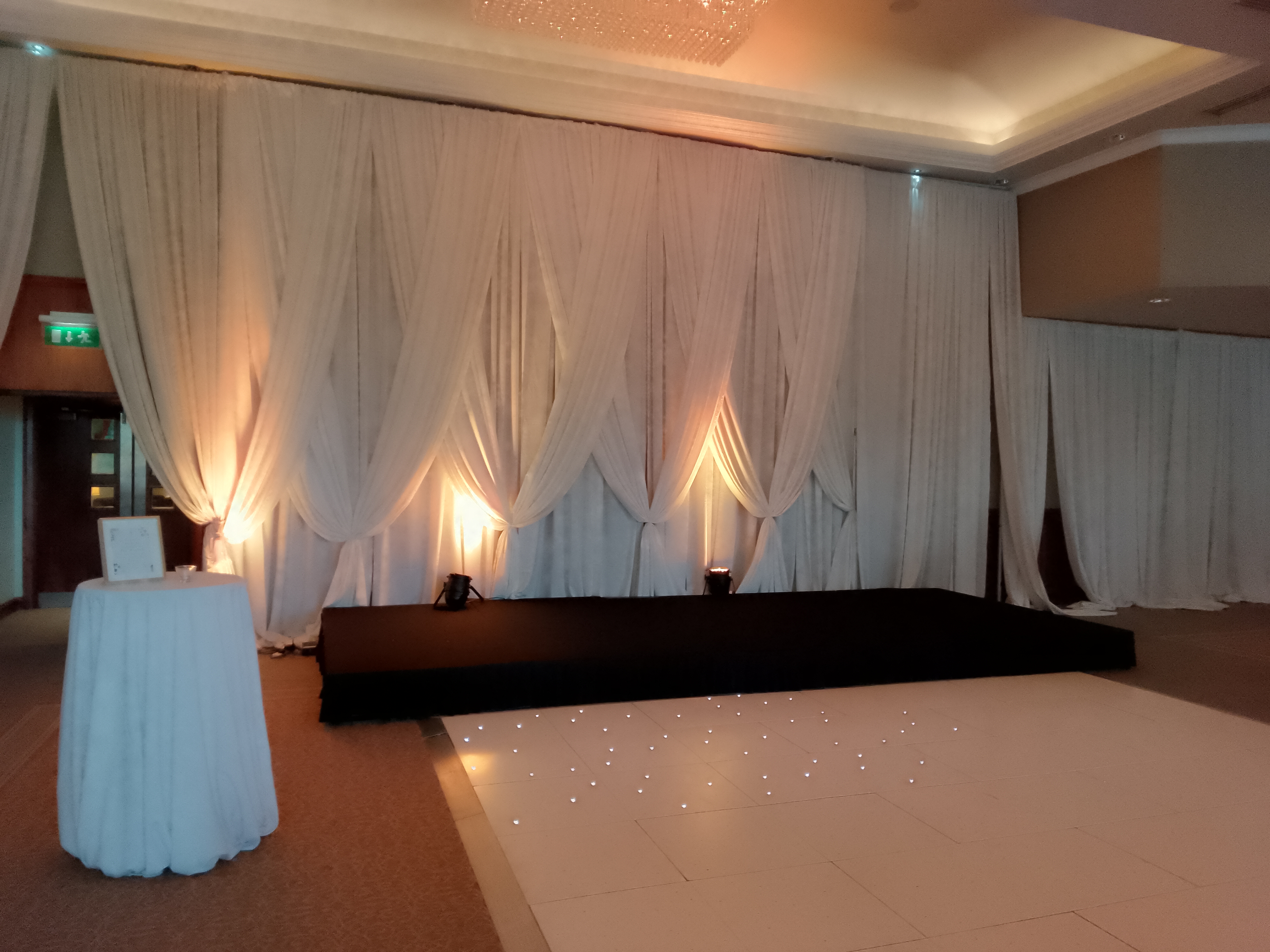 Full room draping with white fairy light back drop. Our fully telescopic system is able to reach ceilings that reach a height of 5 meters.