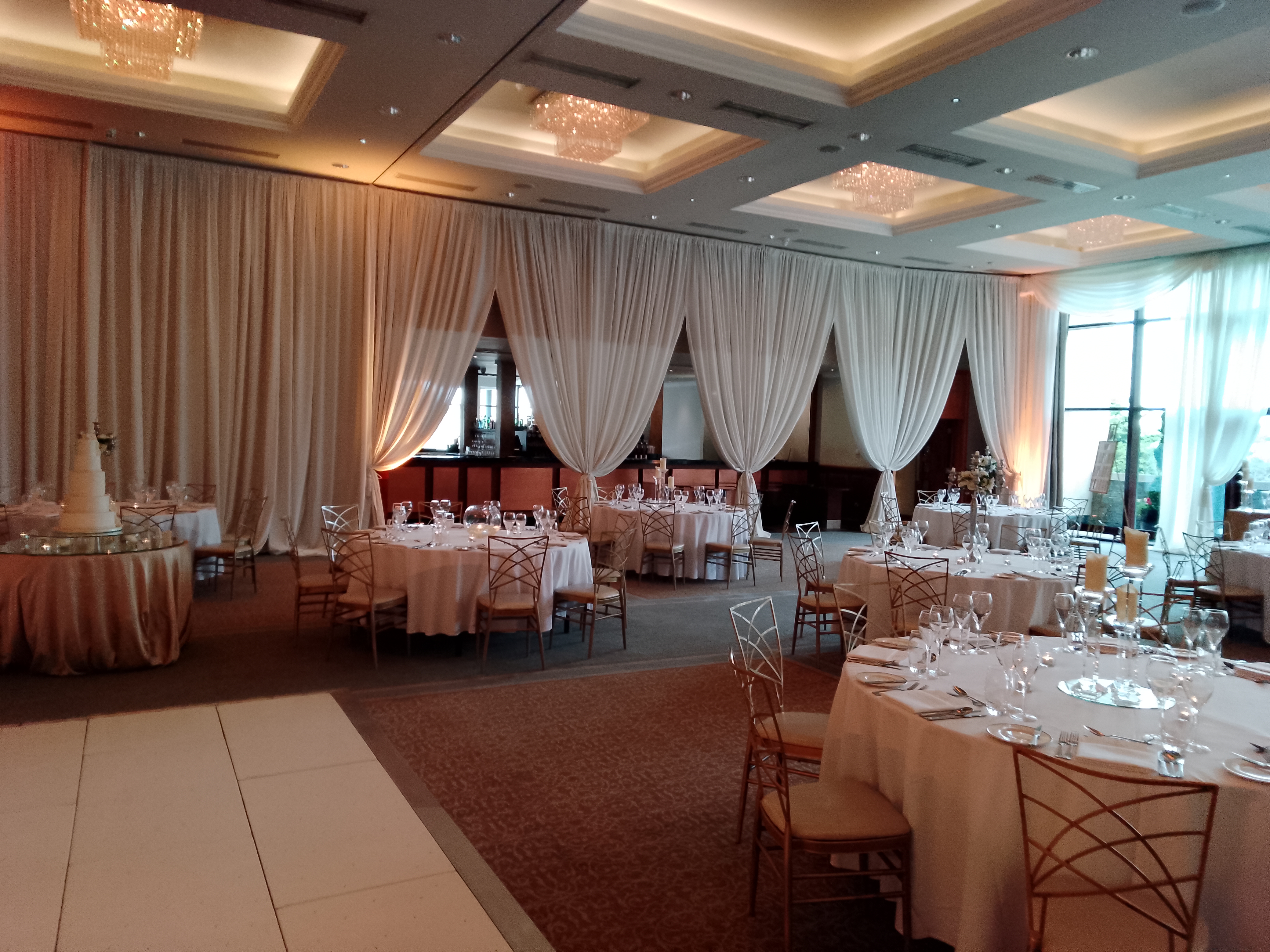 White fairy light back drop with double draping. Notice how all of the swags are symetrical and even, you will not find any other draping company capable of such high quality fabric dressing.